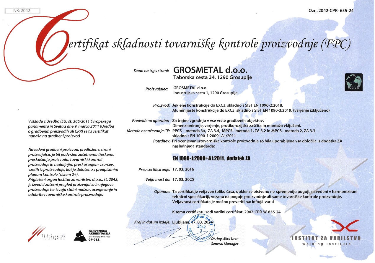 Za izvajanje jeklenih konstrukcij imamo pridobljene ustrezne certifikate in ustrezno izobražen kader, da ta dela lahko kakovostno izvedemo.